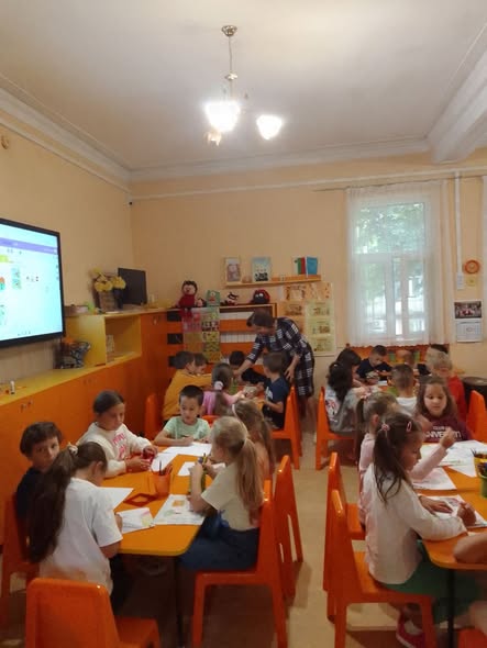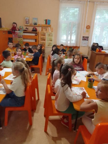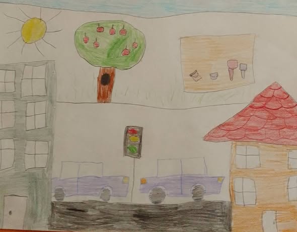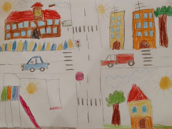 ОН: Изобразително изкуство Тема: "Моят безопасен път до детската градина" Чрез своите картини децата от четвърта група "Калинки" показаха, че познават нормите за безопасно придвижване по пътна маркировка.