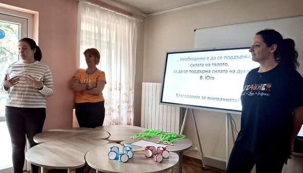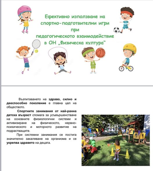 Днес се проведе вътрешна квалификация на педагозите в ДГ 6 “Българче”. Методическо обединение “Спорт” в състав: Александрина Огнянова-Иванова, Тинка Боянова и Ралица Кирилова, представи материали на Тема: “Ефективно използване на спортно-подготвителни игри при педагогическото взаимодействие в ОН „Физическа култура"”. Щафетната игра “Смятай и бягай” предизвика положителни емоции сред всички състезатели, които показаха и ефективна работа в екип.